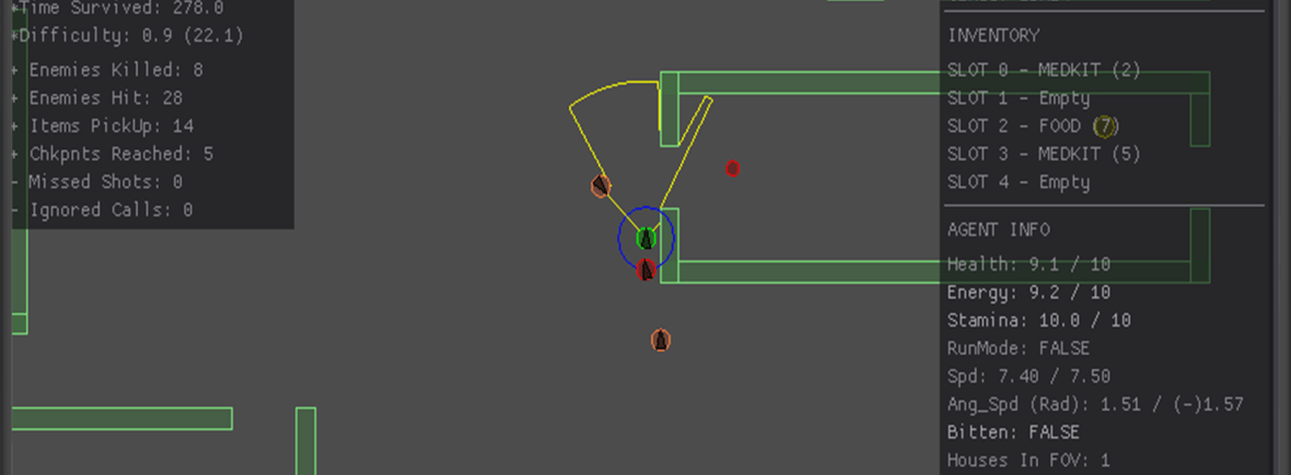 The world where the AI lives in is random generated world. Houses are visualized with green lines placed in a rectangular form. Enemies are indicated with a red color and the AI with a green color. In the world there are yellow dots. These yellow dots represent items. The items included are a medkit (restores health), food (restores energy), a pistol (shoot at enemies) and garbage (no effects).