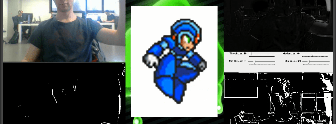 This project uses a webcam connected to the host desktop/laptop. Using image subtraction from the input of the webcam the program catches motion. Depending on the region where motion is detected Megaman will perform a certain action.